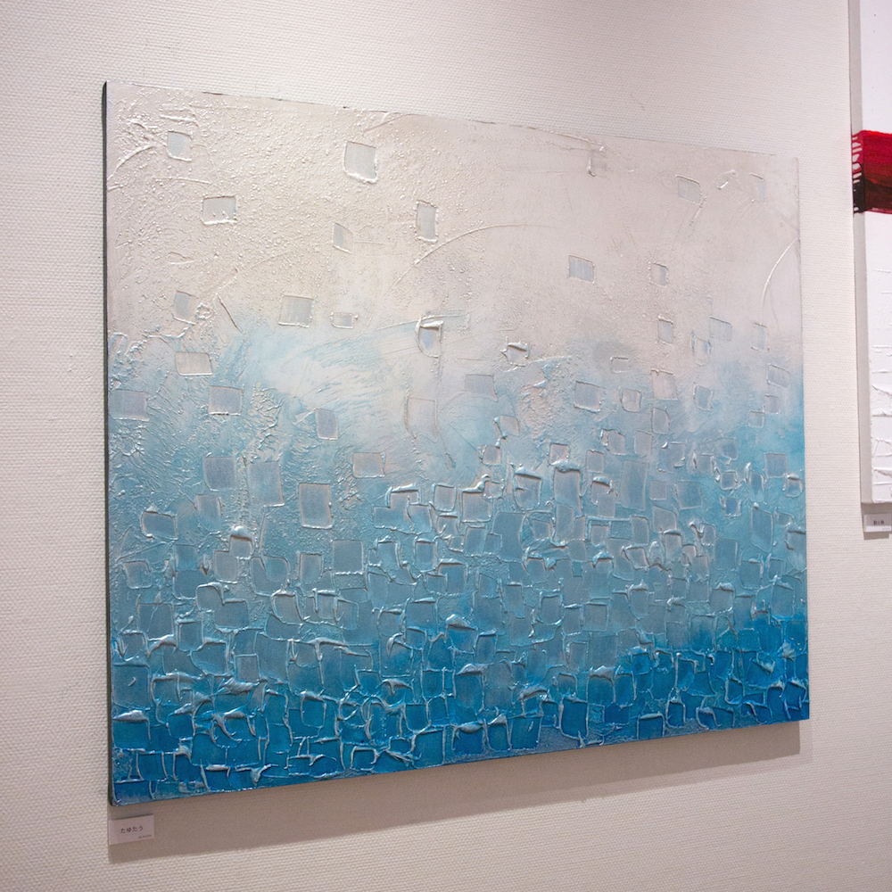 | Statement/note 海の波しぶきが風に吹かれ、たゆたいながら舞う様子。 骨材を混ぜた絵の具で、テクスチャー感を出し、ブルーから白のグラデーションで波しぶきを表現。 最後にシルバーを薄くかけ、見る角度によりメタリックに輝く。 |
