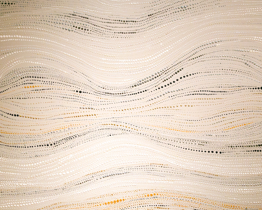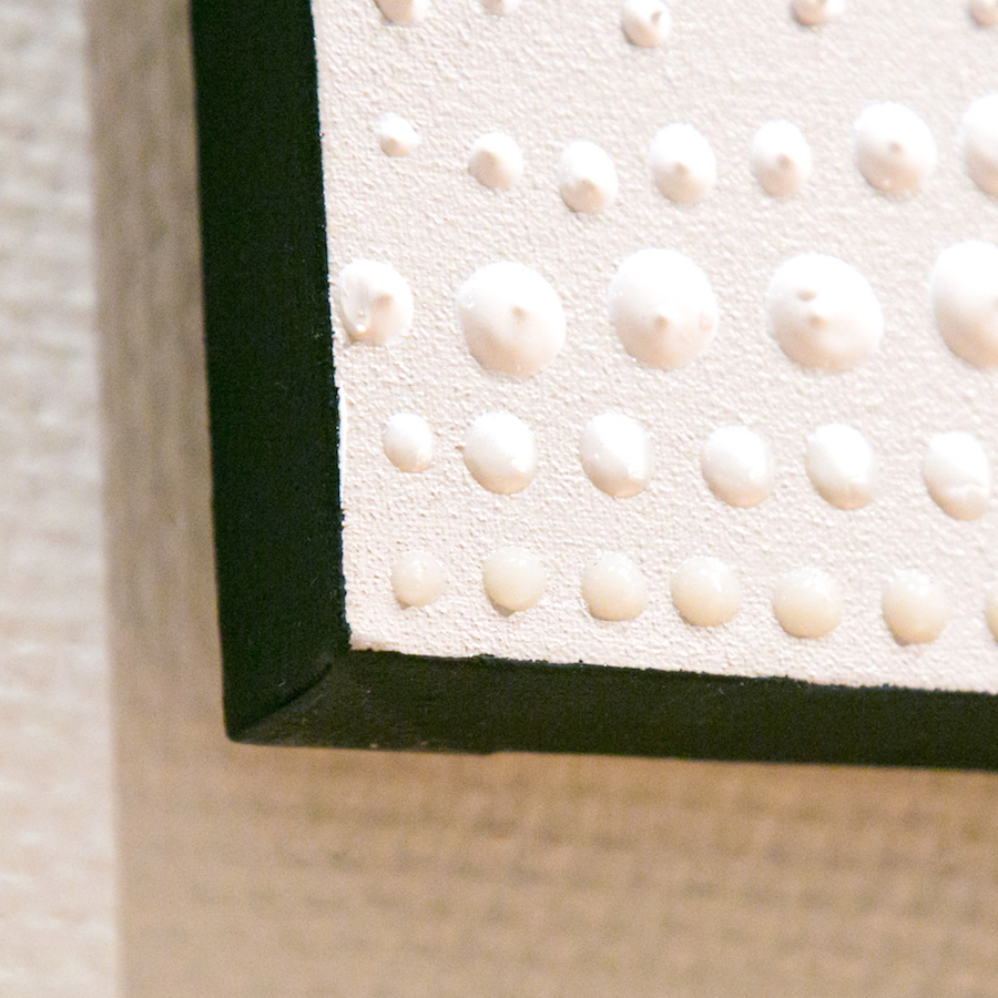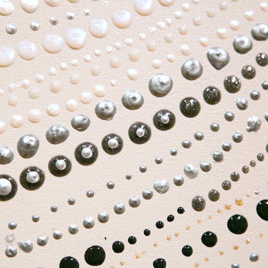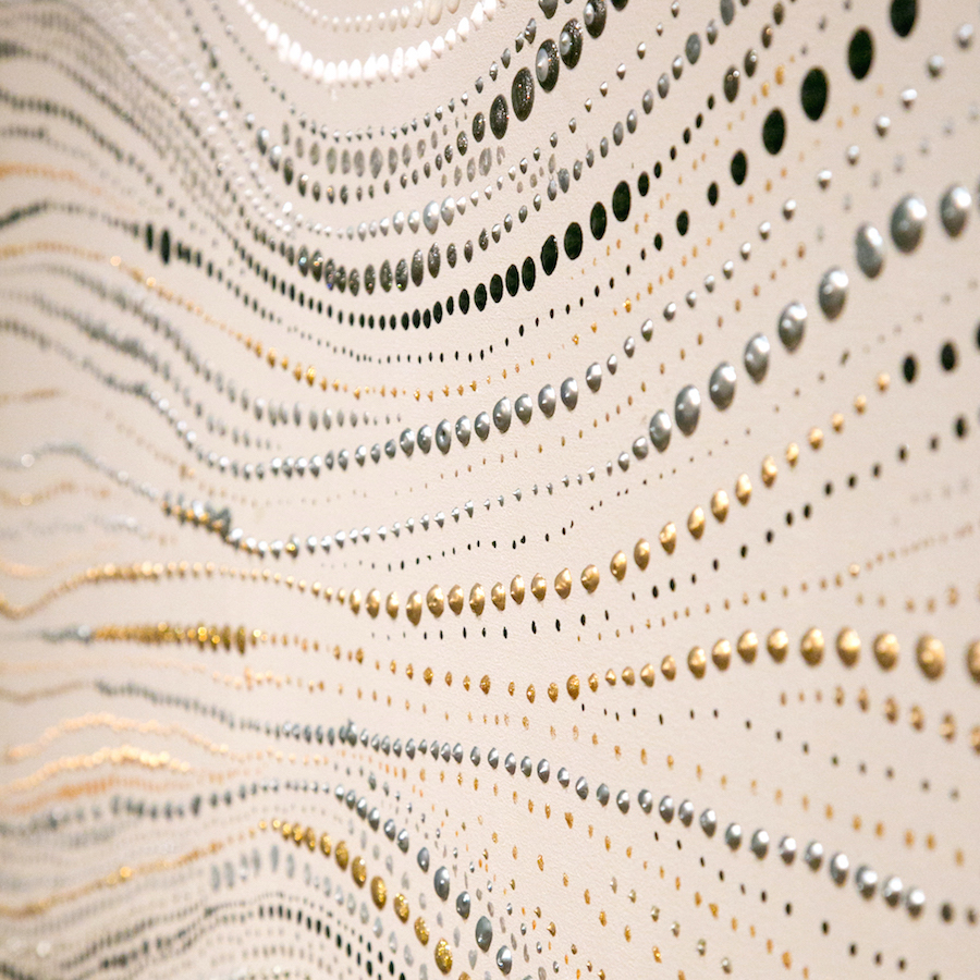 | Statement/note 大小様々な色や、点。 ひとつひとつは、それぞれだが、それらがつながり、ひとつの形を成形していく。道もまた同じ。 点ひとつひとつが立体的にもりあがり、メタリックに光る。 |