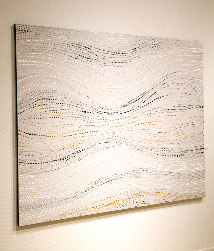 | NO.item | 20171015-11 | Statement/note 大小様々な色や、点。 ひとつひとつは、それぞれだが、それらがつながり、ひとつの形を成形していく。道もまた同じ。 点ひとつひとつが立体的にもりあがり、メタリックに光る。 |