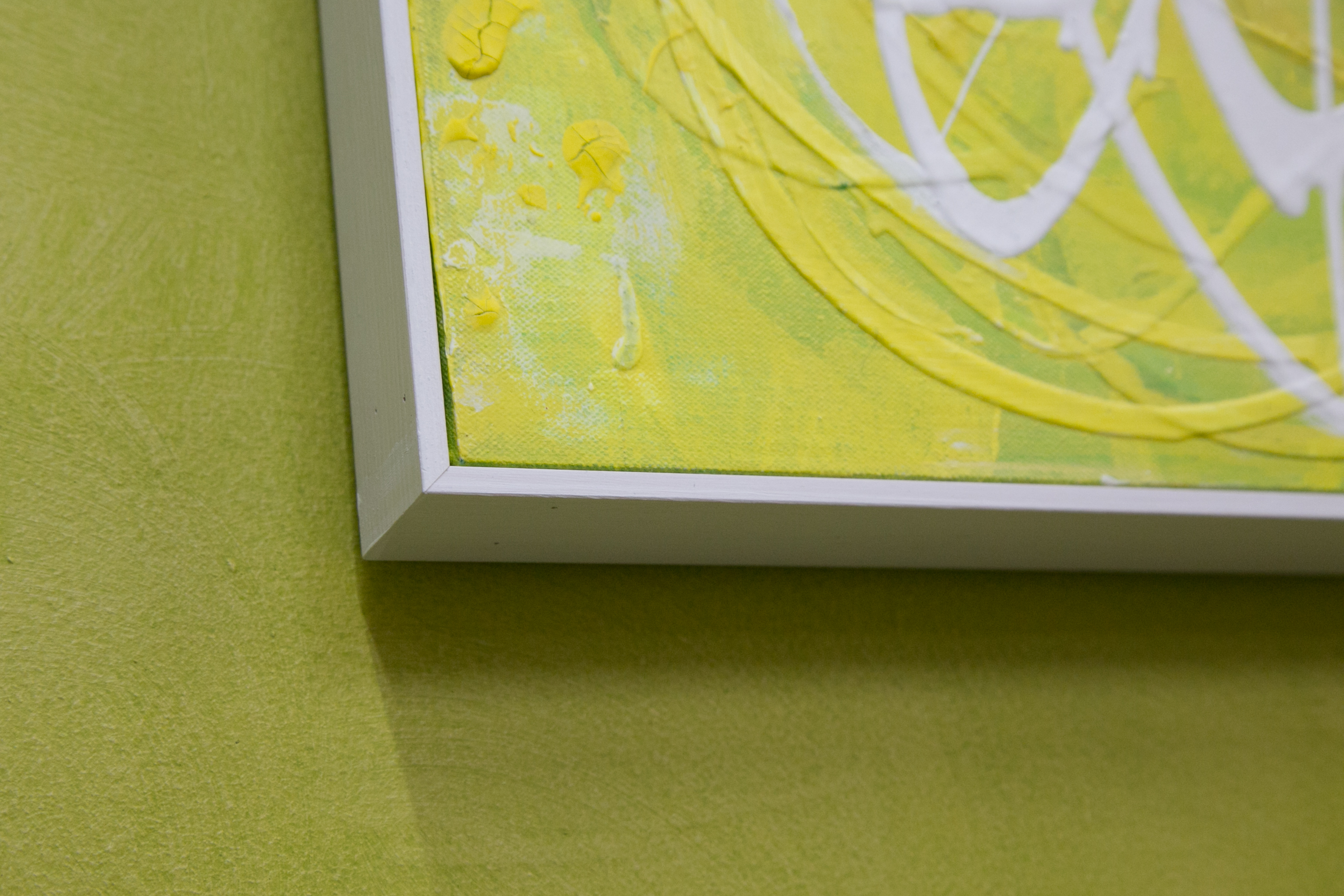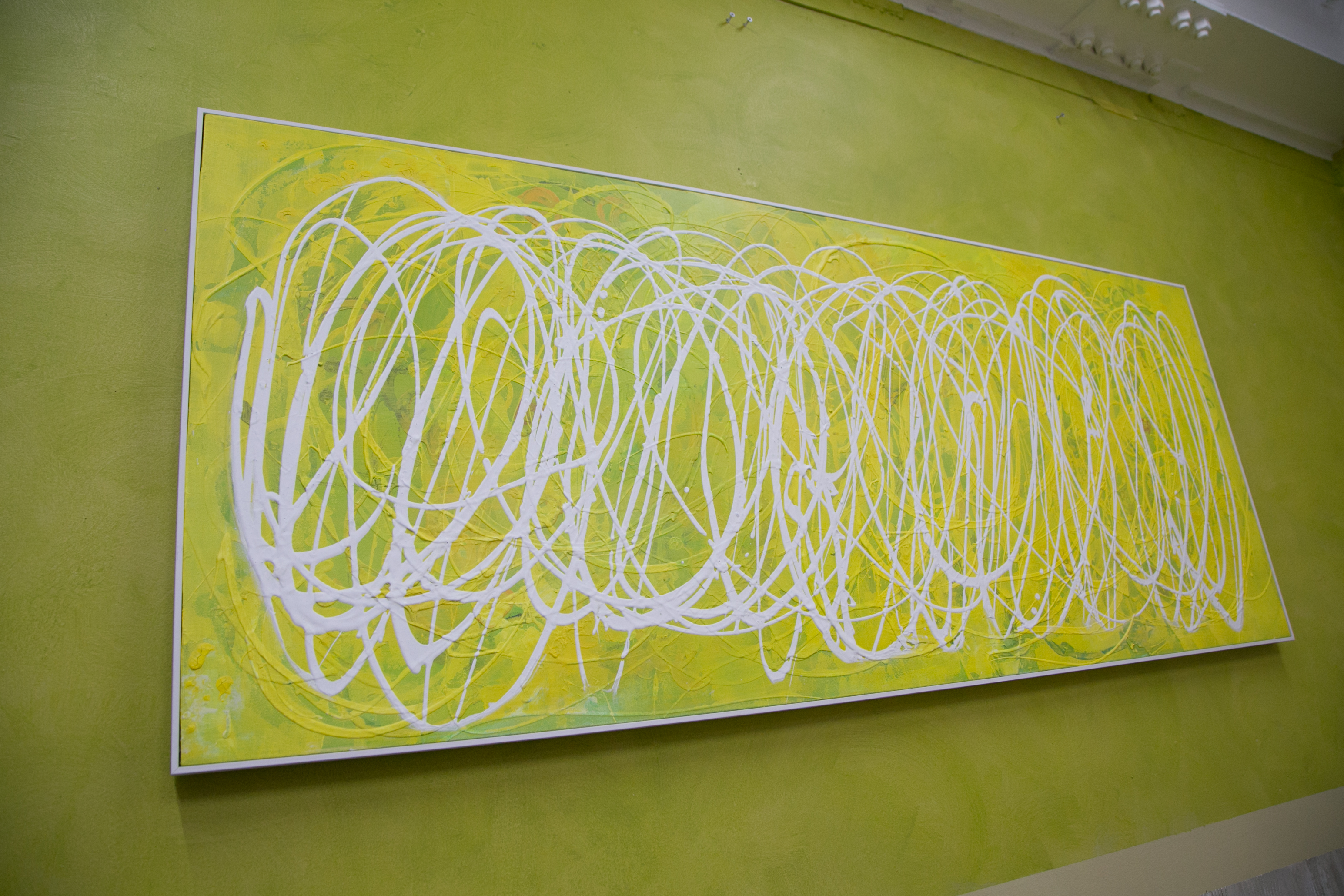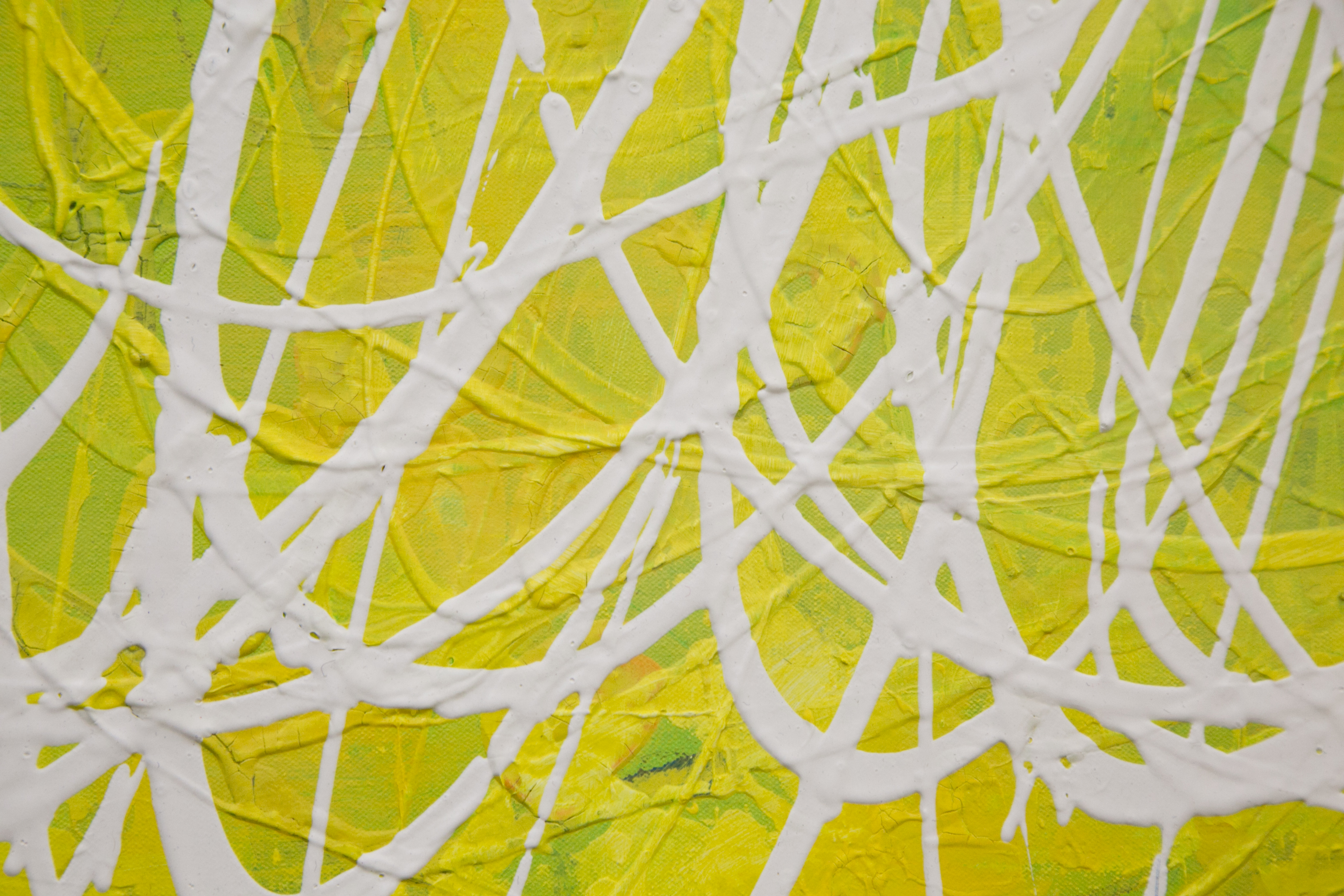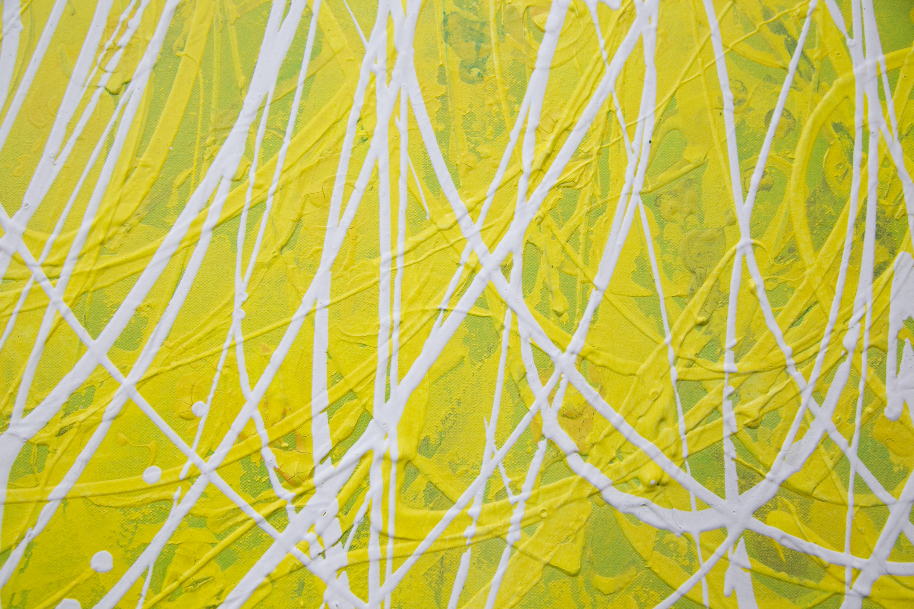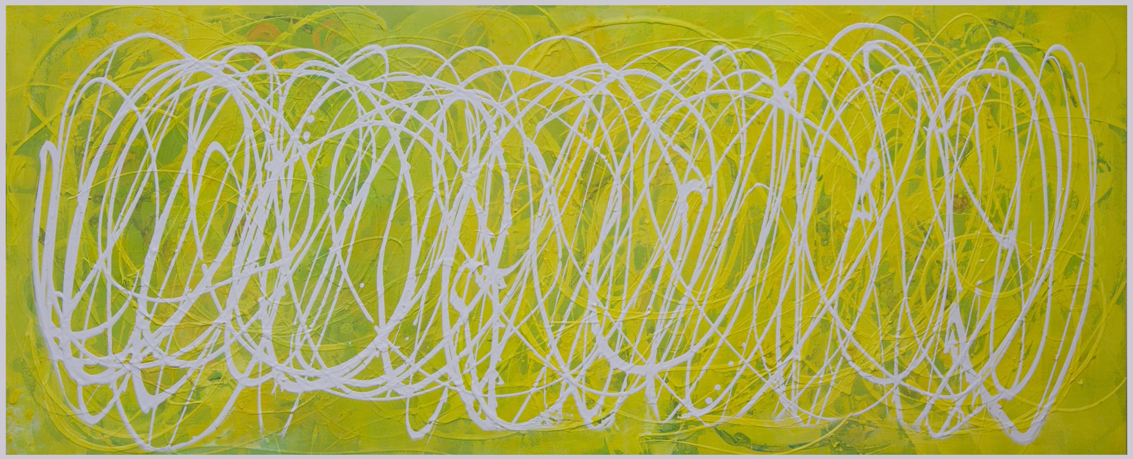 | Statement/note 新宿髙島屋1Fの天井画に描いた時に出来たシリーズ「つなぐ」。 今までは絵具の中に存在していたラインが今度は画面にとびだすように描かれた。 チューブから直接出した絵具で、立体感や躍動感のあるラインを描いている。 この作品はミモザの花をイメージした。 制作年→2017年 |