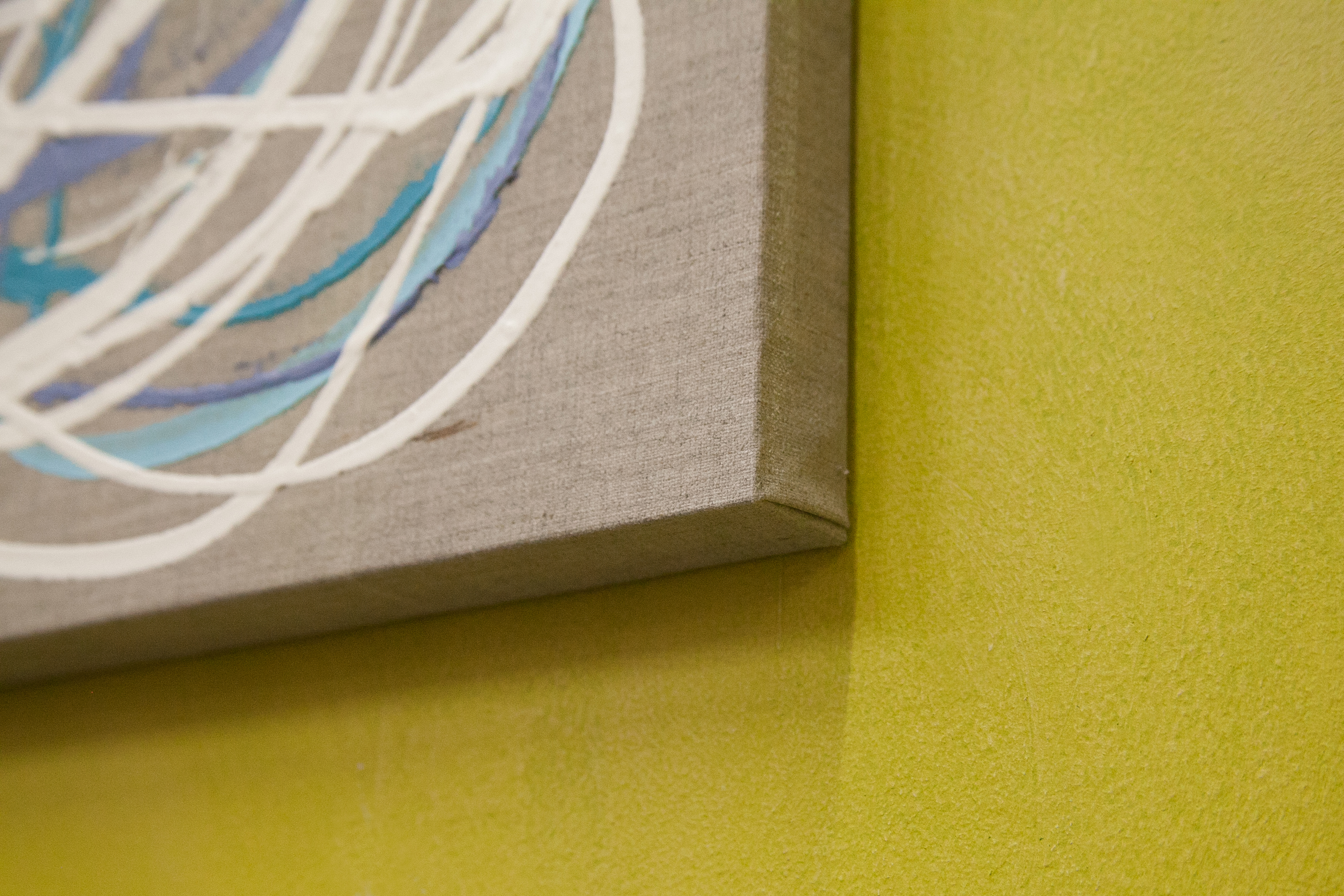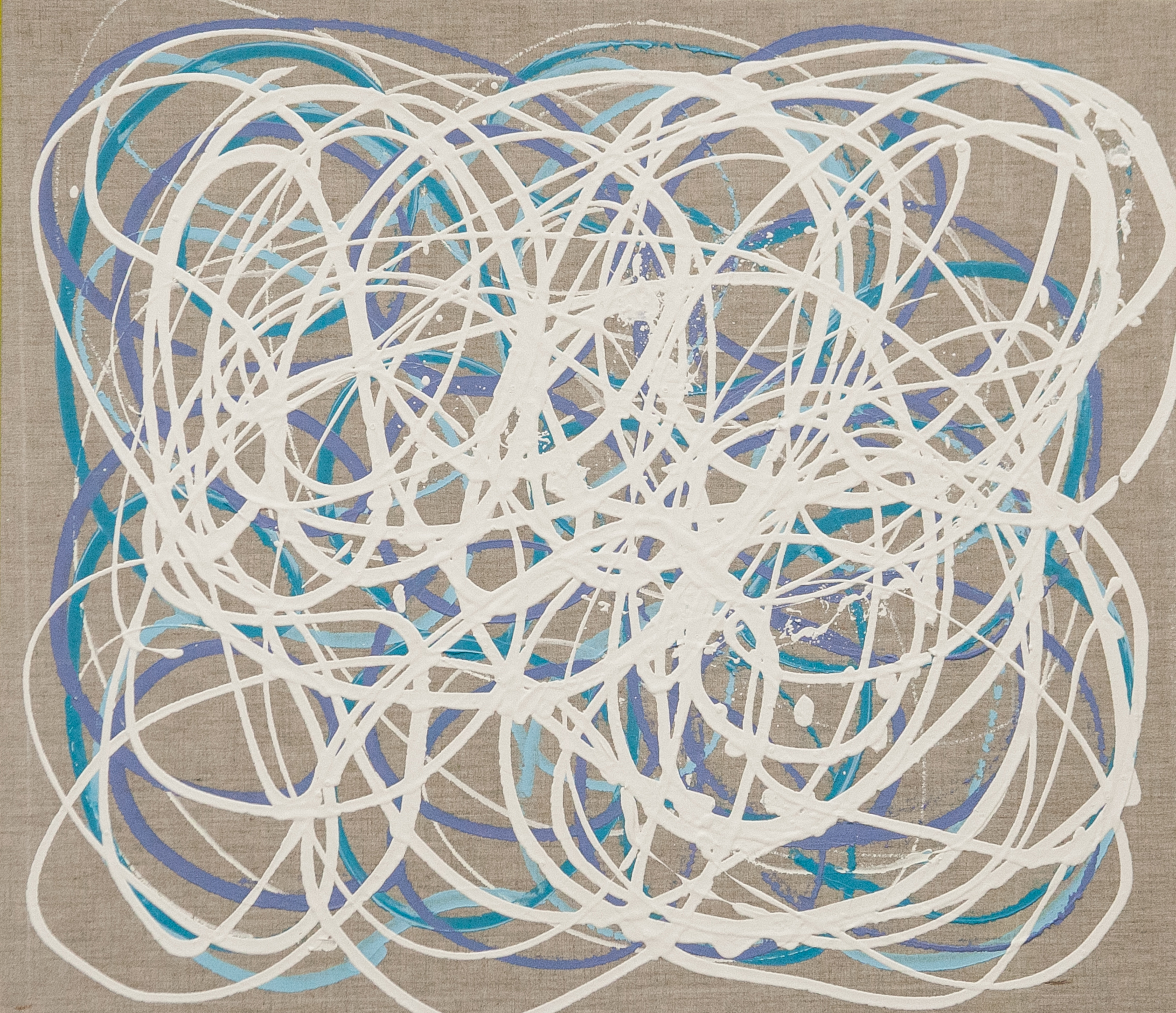 | Statement/note 新宿髙島屋1Fの天井画に描いた時に出来たシリーズ「つなぐ」。 今までは絵具の中に存在していたラインが今度は画面にとびだすように描かれた。 麻キャンバスの上に、チューブから直接出した絵具で、立体感や躍動感のあるラインを描いている。 |