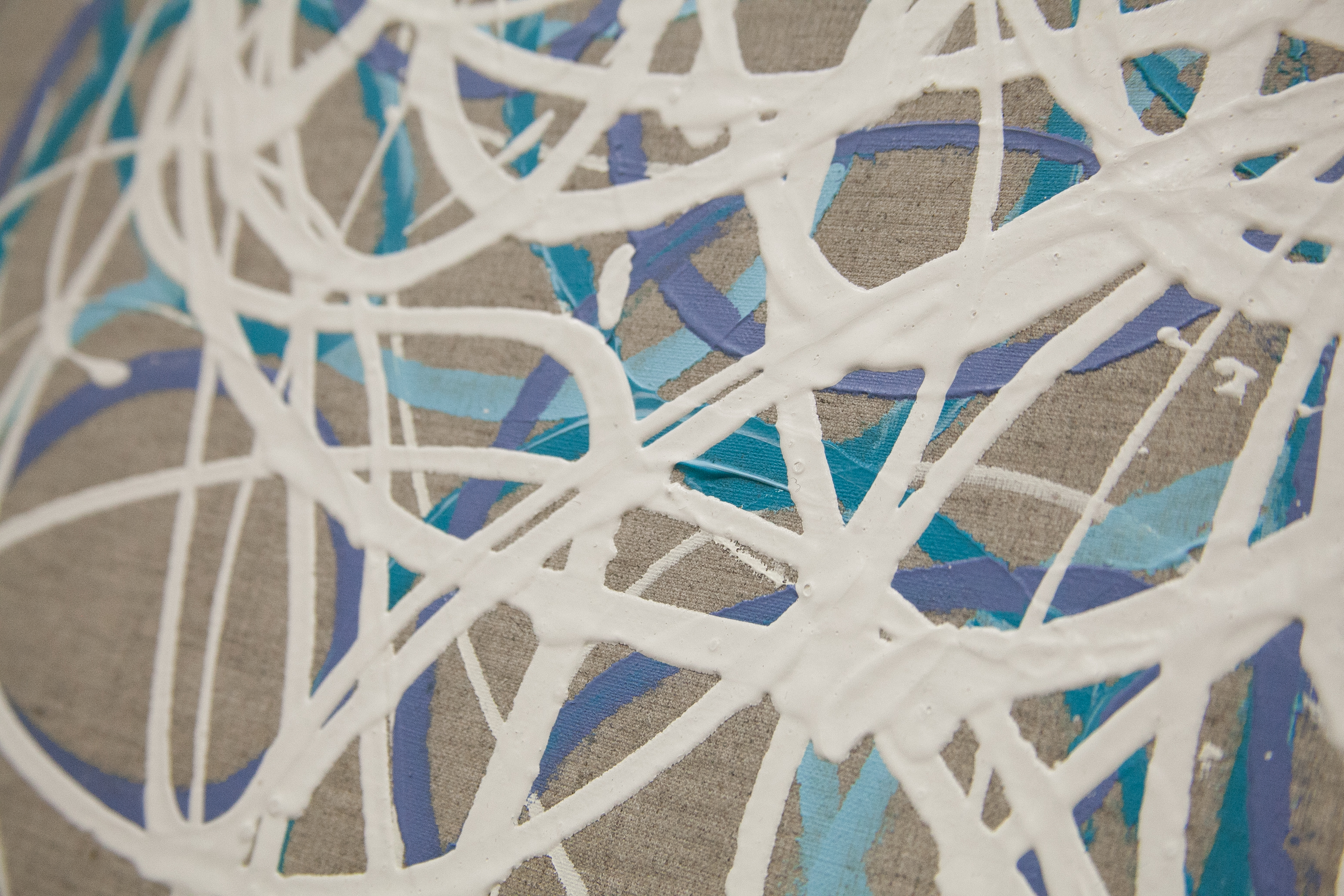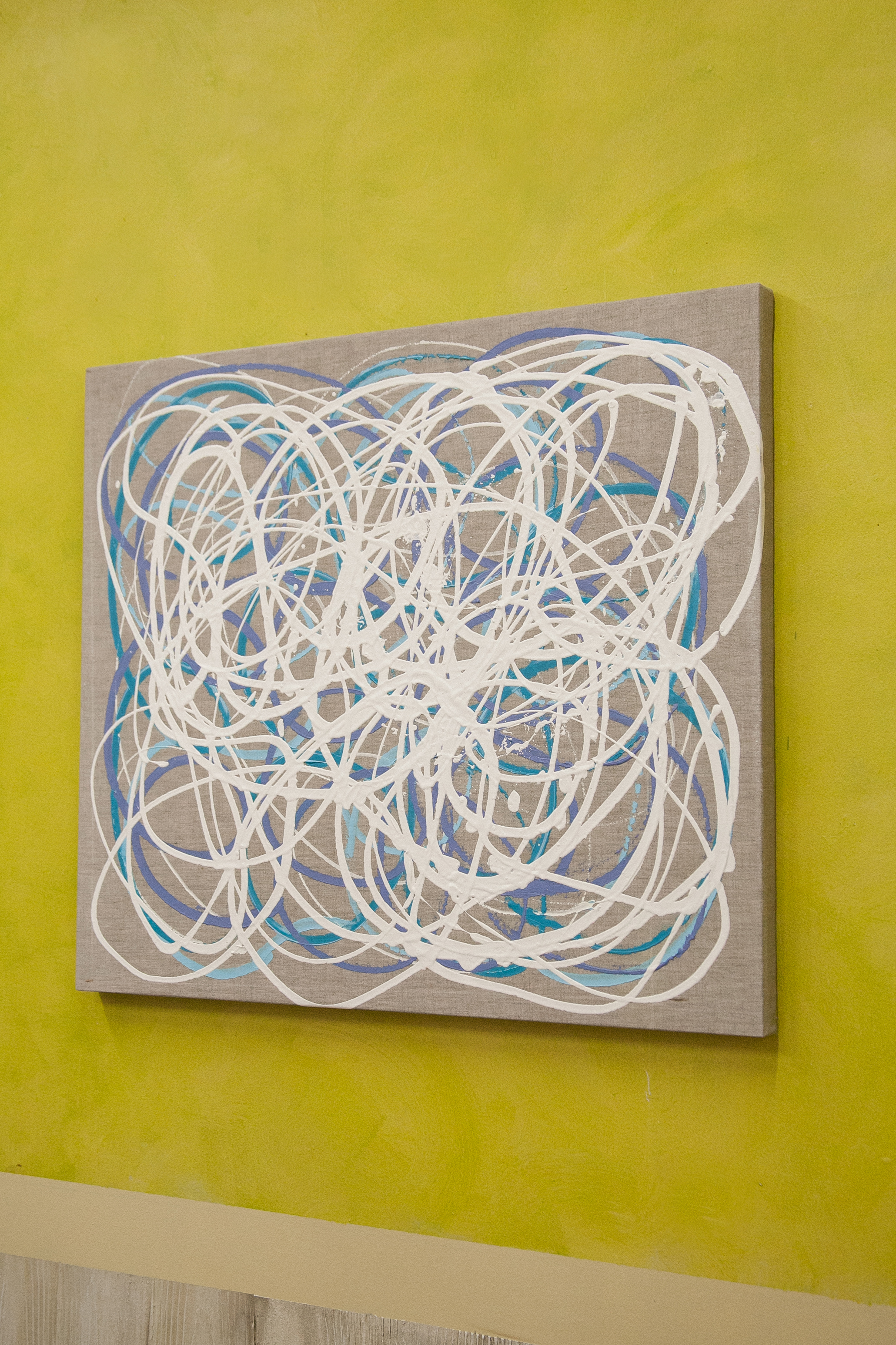 | NO.item | 20170509-43 | Statement/note 新宿髙島屋1Fの天井画に描いた時に出来たシリーズ「つなぐ」。 今までは絵具の中に存在していたラインが今度は画面にとびだすように描かれた。 麻キャンバスの上に、チューブから直接出した絵具で、立体感や躍動感のあるラインを描いている。 |
